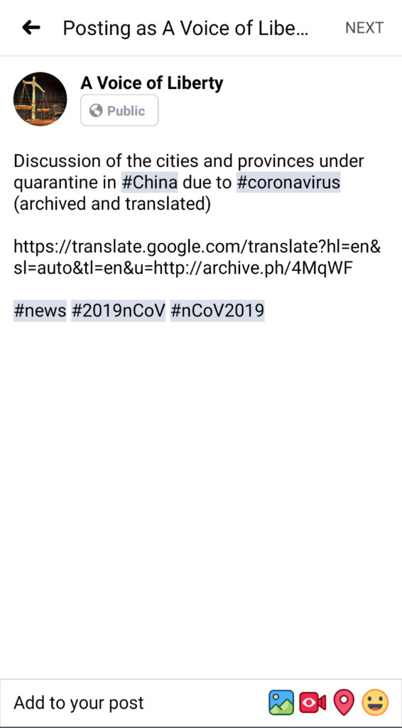 Twitter and Google have also stepped up efforts this week to guide their users to verified sources on the subject.What this means in reality is that content discussing which cities and provinces within China are now under quarantine is banned from Facebook. I can attest to this personally, as a posting I made to social media earlier to a Chinese media site discussing the quarantine would not post to my Facebook page, even though other content posted just fine.